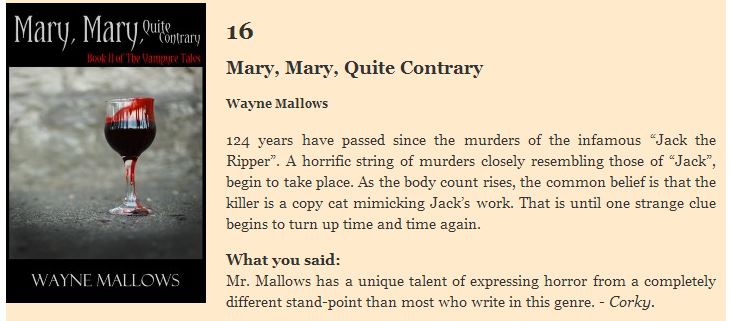 The initial vote got the book from within the masses of 50,000 nominations to the top 100/top 10 in the horror genre and finally Number 1 in horror and # 16 over all!